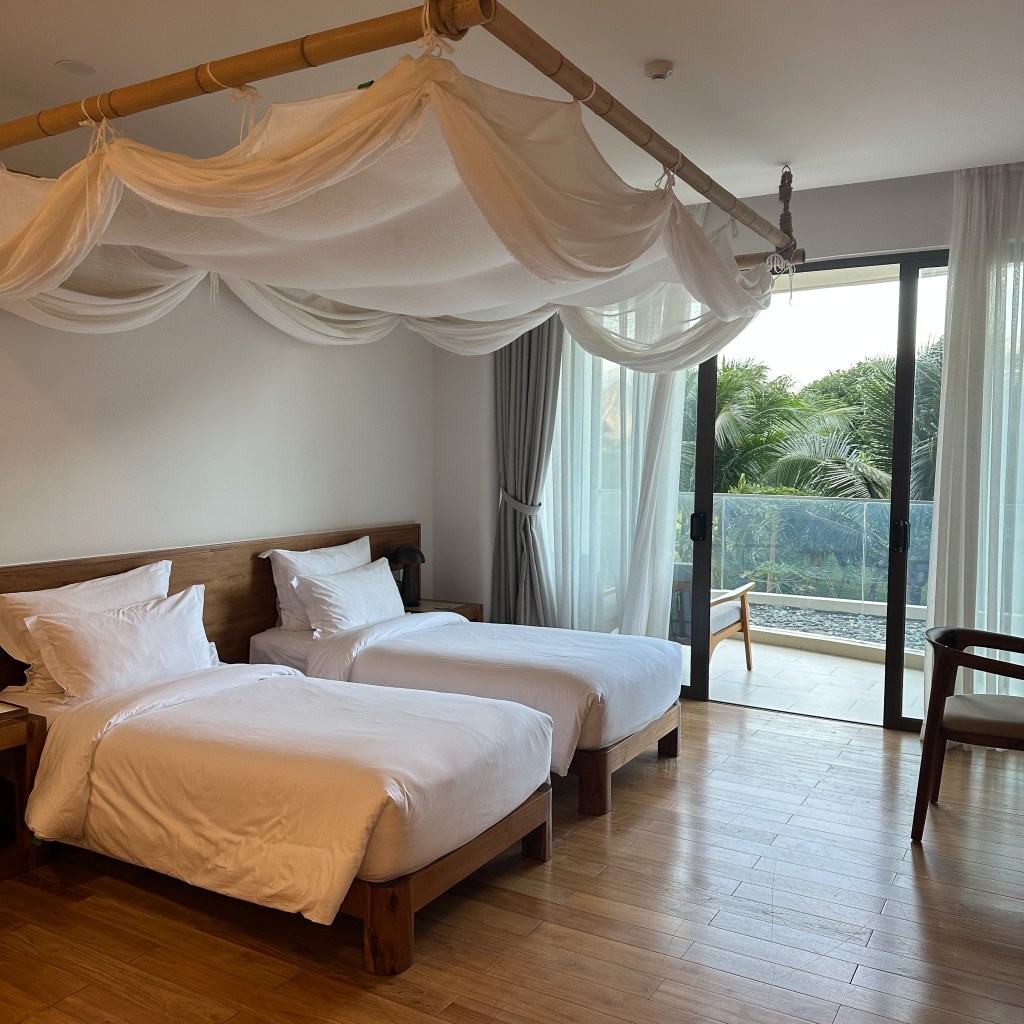 The room exceeded expectations in terms of size and featured a modern design. I stayed in a second-floor room with a great view of parts of the resort and the walking trails. The bed was comfortable yet felt slightly small. Due to the large windows, securing them properly is essential, as wind noise can be significant. January in Vietnam is relatively cold and windy, and the room was a bit chilly, with the heating system seemingly not functioning well.